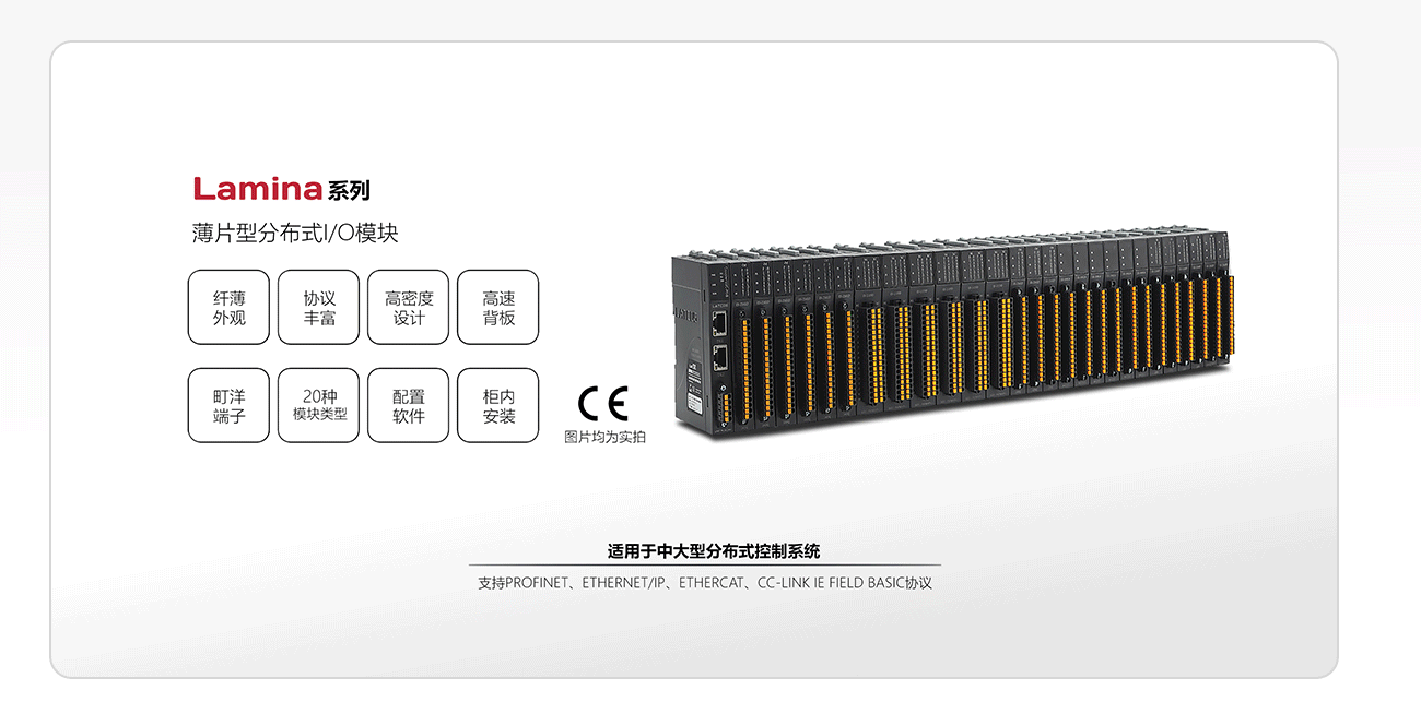 LAMINA系列薄片式遠程I/O,是展示期間最受客戶關(guān)注的產(chǎn)品。該系列I/O支持5種PLC總線協(xié)議,其中包括PROFINET,EHTERNET/IP,ETHERCAT,CC-LINK IE FB,MODBUS TCP。可支持32個模塊擴展,無需饋電模塊,模塊種類豐富,包含了數(shù)字量輸入輸出,模擬量輸入輸出,熱電偶,熱電阻,脈沖輸入、輸出,定位、485/232等多達20多種功能模塊。
