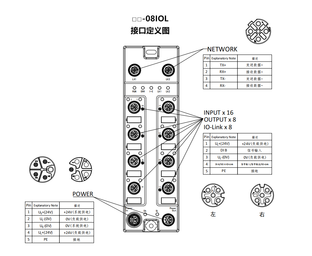 電源接口:Power In:1×M12,L-Code,4P針;Power Out:1×M12,L-Code,4P孔