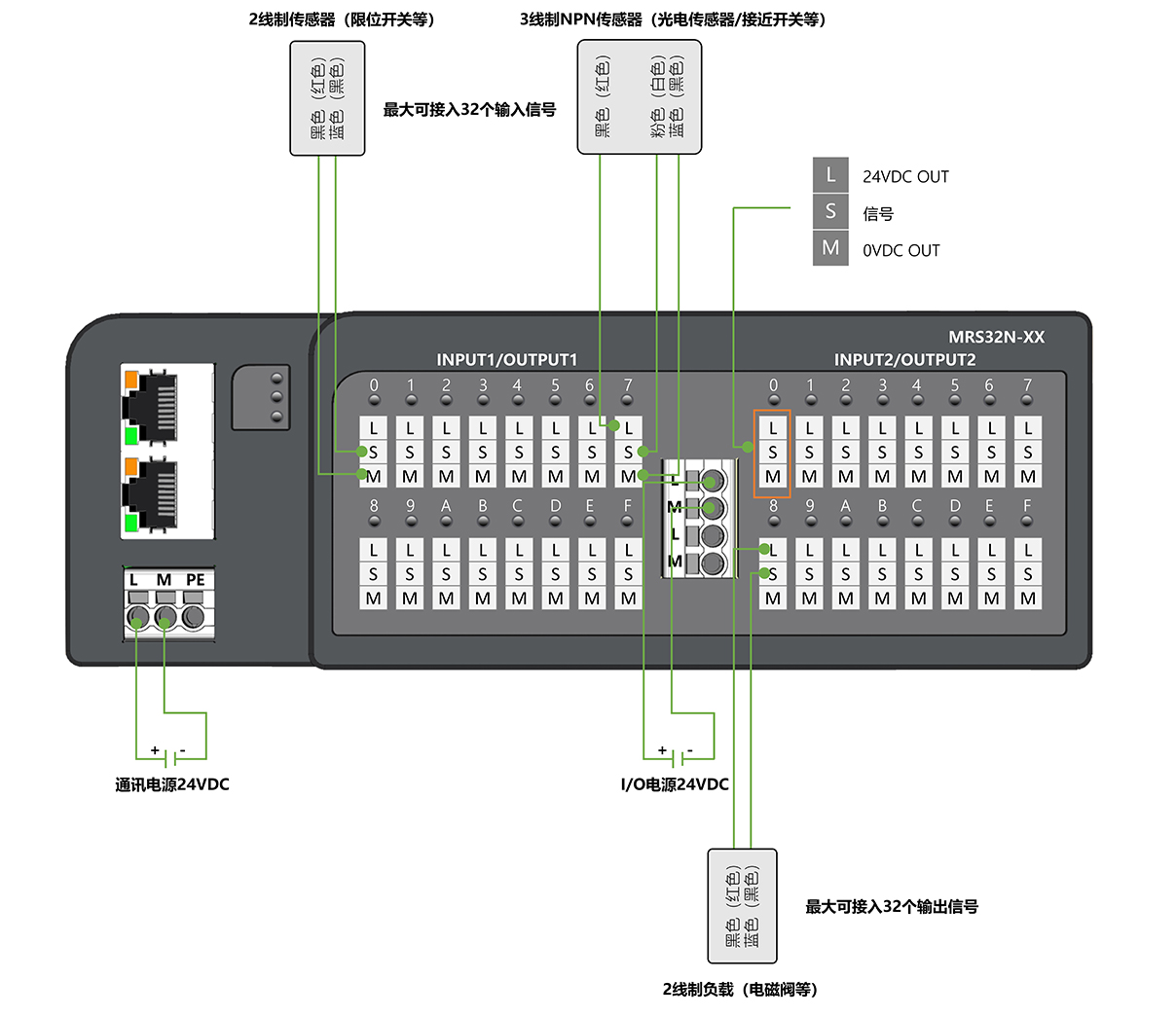 面板式快接線分布式I/O,PROFINET通訊,2xRJ45,可級聯(lián);NPN,32xDI/DO自適應,24VDC,單通道最大輸出0.5A,歐式彈簧端子;導軌安裝&打孔安裝(下單時需備注)
